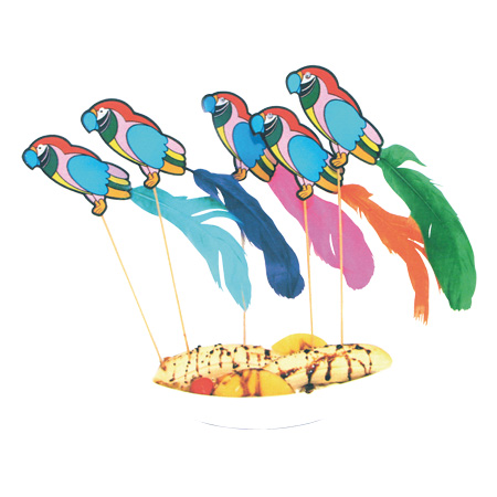 Assortit de lloro i plomes de colors amb escuradents incorporats per a crear una presentació original en tota classe de postres. Recomanades per a col·locar fàcilment en cupcakes, pastissos, gelats, còctels i mones de Pasqua.