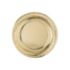Mida Ø29Cm. Plat fabricat amb cartró blanc gris estriat i capa de polièster metàl·lic or. Amb adhesiu a l’aigua apte per a ús alimentari. Té un gramatge de 817 gr/m2