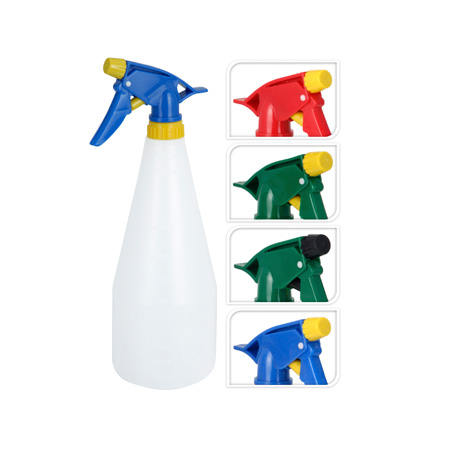 Capacitat 1L. Ampolla amb polvoritzador a pressió. Útil tant a la jardineria com per a la neteja de la llar. Colors assortits.