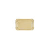 Medida 10x16Cm. Bandeja fabricada en cartón blanco gris estriado y capa de poliéster metálico oro. Con adhesivo en el agua apto para uso alimentario. Tiene un gramaje de 417 gr/m2.
