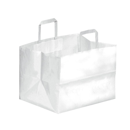 Medida 35x23xH25Cm. Bolsas take away de celulosa blanca con asas planas. Biodegradables y aptas para el contacto directo con alimentos. Gramaje de 100g.
